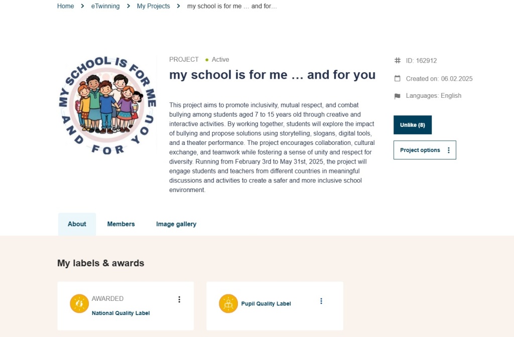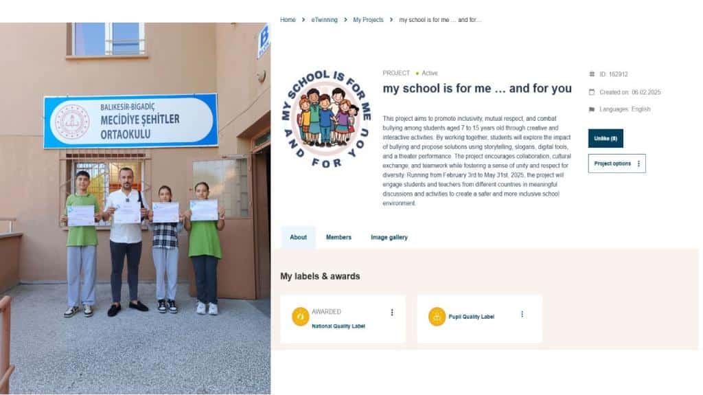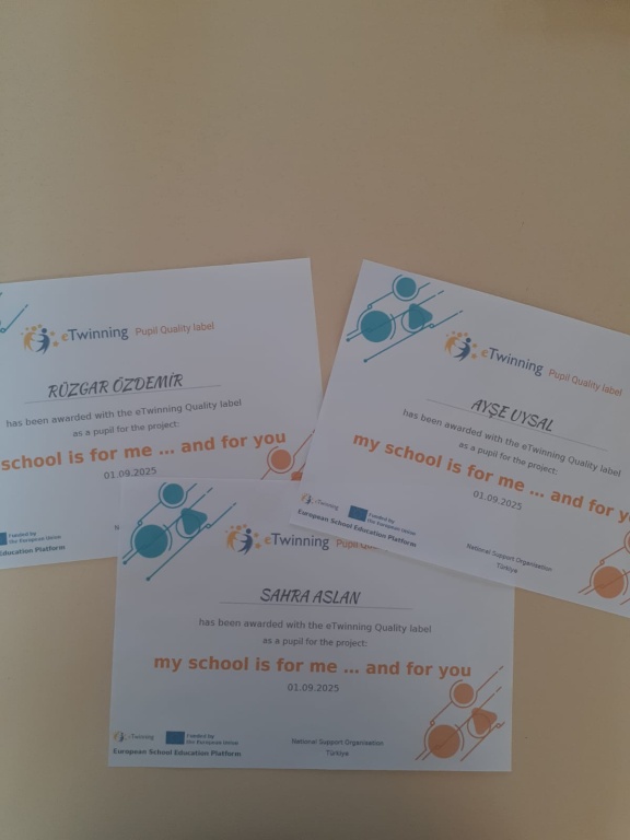 Okulumuz İngilizce Öğretmeni Sinan GÜNDOĞAN rehberliğinde 2024-2025 Eğitim-Öğretim yılı Şubat ayından beri yürütülmekte olan eTwinning projesi ULUSAL KALİTE ETİKETİ ( NATIONAL QUALITY LABEL ) almaya hak kazanmıştır. Projede yer alan öğrencilerimizde eTwinning KALİTE ETİKETİ ( PUPIL QUALITY LABEL ) almaya hak kazanmışlardır. Projede emeği geçen öğretmen ve öğrencilerimizi tebrik ediyoruz ve başarılarının devamını diliyoruz.